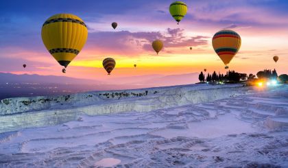 Полет с балон с горещ въздух над снежно белите варовикови травертини на Памуккале, долината Меандър и известните останки на древния град Хиераполис. Ще се насладите на спиращите дъха панорамни гледки от над 1000 метра височина, ще дегустирате шампанско и ще получите сертификат за участие в полета.