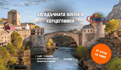 Туристическа програма; Ден 1 Отпътуване от гр.Кърджали в 03:00 часа пред Дома на Културата, в 05:00 часа от Пловдив - OMV Хотел Санкт Петербург и в 06:00 от София - Автогара Сердика по маршрут НИШ-КРУШЕВАЦ-ВИШЕГРАД. Първата ни спирка е Уникалният Андричград, популярен сред местните жители още като Каменград, разположен в сърцето на Вишеград и едно от най-известните места в Босна и Херцеговина. Андричград е своеобразен проект на популярният сръбски филмов режисьор Емир Кустурица. Мечтата му да създаде етноселище, представящо Балканите по такъв начин, какъвто щяха да изглеждат, ако в действителност всеки един от завоевателите на тези земи не събаряше всички вече изградени съоръжения. Комплексът Андричград представлява удивително съчетание от разнообразни архитектурни стилове. Той е съставен от различни заведения, сред които тематични магазини, ресторанти и кафенета. За посетителите на мястото са изградени увеселителни атракциони и прекрасен театър. Андричград често се превръща в декор за разнообразни филмови продукции и става сцена за провеждането на местния ежегоден филмов фестивал, преминаващ под патронажа на Кустурица. Свободно време за разглеждане- около час и половина. Пристигане в Сараево. Настаняване в хотел 3*. Нощувка. Ден 2 Закуска. Пешеходна разходка в централната част на Сараево – градът известен с красивите джамии, павирани улички и площади, старите квартали, автентичната турска „баш чаршия” с ориенталски магазини за сладкиши и традиционна босненска кухня и кафенета. Често е наричан „Балканският Йерусалим” заради космополитния си дух и мирното съжителство на католици, православни, мюсюлмани и евреи. Разглеждане на Националния театър, Синагогата, Кметството, Катедралата, Баш чаршия, Императорската джамия, Латинския мост, където е убит Франц Фердинанд; Морича хан – единственият съхранен хан от времето на Османците, днес превърнат в магазин за килими и традиционен ресторант. Следобяд свободно време или Екскурзия до Босненски пирамиди, по желание и с допълнително доплащане. Те са разположени на 30 км от Сараево, на височина от 700 м., които се считат за по-стари от египетските. Място, за което се твърди, че е заредено с необикновена енергия, откъсващо от ежедневието, свързано с нови и непознати усещания. Възможност за разглеждане на тунелите и пирамидата на слънцето (входна такса 10 евро).Според изследванията пирамидата е на поне 25 000 години и може би се отнася дори към последния етап от ледниковата епоха, която е свършила преди повече от 10 000 години. Връщане в Сараево. Следобяд .Нощувка. Ден 3 Закуска. Отпътуване за Мостар – град, включен през 2005 г. в списъка на Световното културно наследство на ЮНЕСКО. Разходка в Стария град, прочут със своите автентични турски къщи, пъстроцветните пазари с традиционни занаятчийски изделия и със Стария мост над река Неретва – символ на мира и съжителството на различни културни и религиозни общности. Посещение на джамията Карагьоз Бей, Католическата църква Дева Мария и часовниковата кула. Свободно време за разходка и обяд. Отправяме се към водопада Кравице ( с допълнително доплащане ).Водопадът Кравице е един от най-красивите природни обекти в Босна и Херцеговина. На много места може да го срещнете и като Кравица, защото така бива наричан в страната. Кравице стана особено популярен през последни
