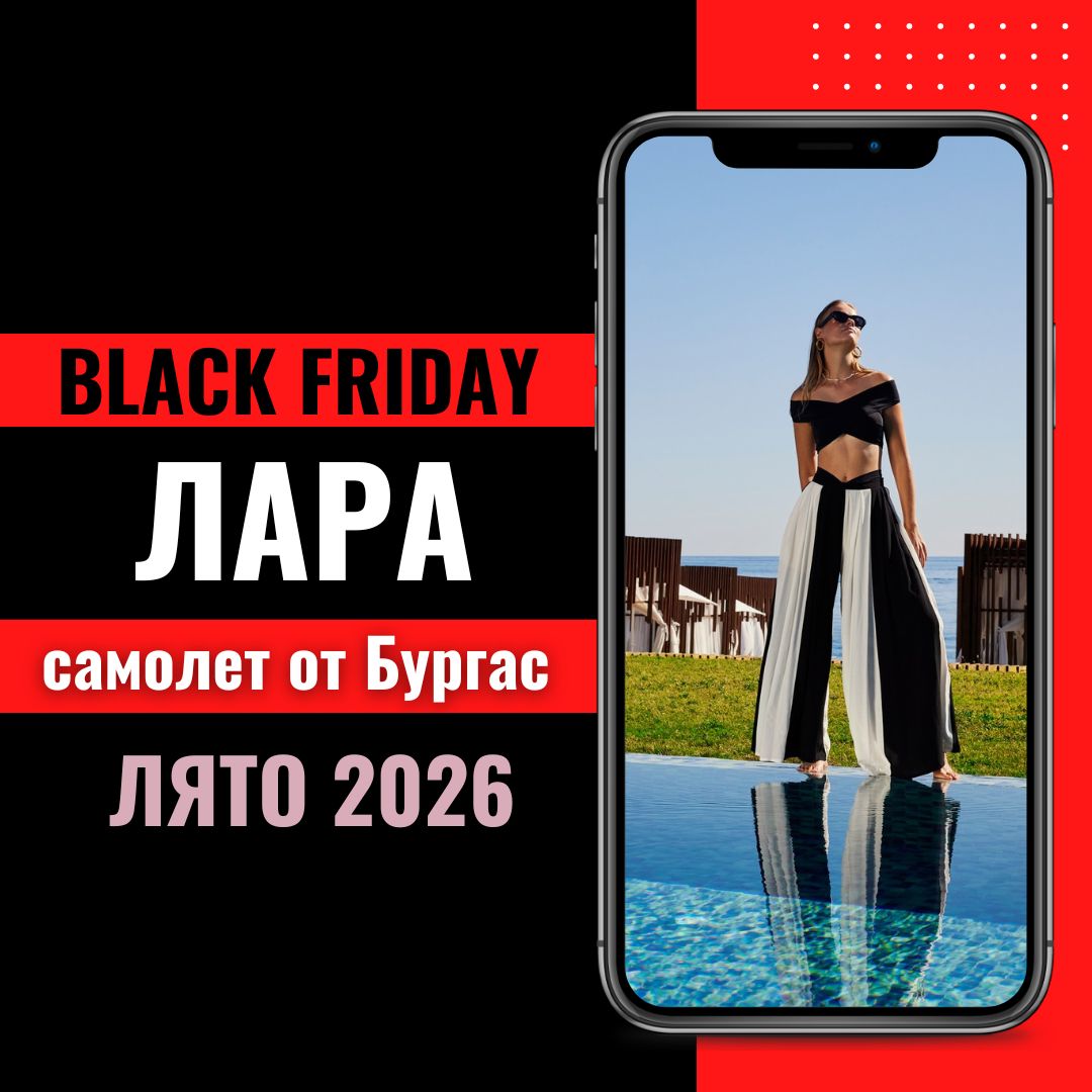 ЧЕРЕН ПЕТЪК ТУРЦИЯ ЛЯТО 2026 Кампания „Плати депозит 35% при записване и доплати до 30 дни преди отпътуване“ - валидна за резервации направени до 30.11.2025. Обявените цени са с динамично ценообразуване, в реално време и са пряко свързани с евентуална промяна в цените и условията на всеки хотел. Хотелите си запазват правото да променят или прекратяват отстъпките и промоциите по всяко време и туроператорът не носи отговорност при евентуална промяна на цената. Затова препоръчваме да се резервира веднага след избор на хотел и оферта. Описание / Транспорт: ПРИМЕРНА ПОЛЕТНА ИНФОРМАЦИЯ АНТАЛИЯ С ПОЛЕТ ОТ БУРГАС - ВТОРНИК Заминаване XC9412: Бургас 16:55 - Анталия 18:20 Връщане XC9411: Анталия 14:30 - Бургас 15:55 Авиокомпания: Corendon Airlines Тип самолет: Boeing 737-800 Адрес: Güzeloluk Mah. 1879 Sok. No: 148 07200 Muratpaşa Antalya, Türkiye * Обявените полетни часове са предварителни. Актуална информация с полетни детайли се изпраща 7 (седем) календарни дни преди датата на отпътуване. ИНФОРМАЦИЯ ЗА ТРАНСФЕРА: Продължителност на трансфер от летище Анталия до райони: