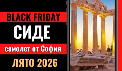 ЧЕРЕН ПЕТЪК ТУРЦИЯ ЛЯТО 2026 Кампания „Плати депозит 35% при записване и доплати до 30 дни преди отпътуване“ - валидна за резервации направени до 30.11.2025. Обявените цени са с динамично ценообразуване, в реално време и са пряко свързани с евентуална промяна в цените и условията на всеки хотел. Хотелите си запазват правото да променят или прекратяват отстъпките и промоциите по всяко време и туроператорът не носи отговорност при евентуална промяна на цената. Затова препоръчваме да се резервира веднага след избор на хотел и оферта. Описание / Транспорт: ПРИМЕРНА ПОЛЕТНА ИНФОРМАЦИЯ АНТАЛИЯ С ПОЛЕТ ОТ СОФИЯ ДАТИ НА ПЪТУВАНЕ В ДЕН СРЯДА: Заминаване: XC 2438 София 13:00 - Анталия 14:45 Връщане: XC 2439 Анталия 10:00 - София 12:00 ДАТИ НА ПЪТУВАНЕ В ДЕН ПЕТЪК Заминаване: FB 8843 София 06:40 - Анталия 08:05 Връщане: FB 8844 Анталия 09:00 - София 11:05 ДАТИ НА ПЪТУВАНЕ В ДЕН НЕДЕЛЯ Заминаване: FB 8843 София 13:45 - Анталия 15:35 Връщане: FB 8844 Анталия 16:25 - София 18:20 Авиокомпания: Corendon Airlines/Bulgaria Air Тип самолет: Boeing 737-800 / Boeing 733 * Обявените полетни часове са предварителни. Актуална информация с полетни детайли се изпраща 7 (седем) календарни дни преди датата на отпътуване. ИНФОРМАЦИЯ ЗА ТРАНСФЕРА: Продължителност на трансфер от летище Анталия до райони: