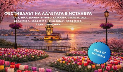 Автобусна програма: 4 дни / 2 нощувки с отпътуване от -Русе, Бяла, Велико Търново, Казанлък, Стара Загора ПРОГРАМА Ден 1: 17:00 ч. Отпътуване от Русе - пред Централна ж.п. гара по маршрут Русе-Бяла-Велико Търново-Казанлък-Стара Загора-Капитан Андреево-Истанбул. Нощен преход. Ден 2: Рано сутринта пристигане в Истанбул. Aко има свободни стаи в момента на пристигане, туристите се настаняват веднага. Ако няма свободни стаи, настаняването ще бъде след 14.00 ч. 08:30 ч. Трансфер до парк Емирган – парка с лалетата. Свободно време в парка за разходка, фото пауза и кафе – Бонус 15:15ч. Панорамна обиколка на Истанбул – вечерно посещение на Българската желязна църква „Свети Стефан“, след това свободно време за разходка из кокетните улички с разноцветни сгради на квартал Балат, където ще може да се опита невероятното турско кафе приготвено на пясък. Обиколката продължава към Галата порт - най-новото пристанище на Истанбул. Това е оживено крайбрежно пристанище, мол и жилищно пространство, което превърна историческото пристанище Karaköy в невероятен център на култура, отдих и кухня – 20 EUR / 40,00 лв. 20:00 ч. Нощна обиколка на Истанбул – на два континента Потопете се в магията на Истанбул след залез слънце – градът , който никога не спи и който свързва Европа и Азия. Панорамна автобусна обиколка през Европа и Азия. Ще преминем покрай емблематични булеварди , осветени джамии и исторически сгради , които разкриват различното лице на Истанбул вечер. Ще преминем по Босфорския мост към азиатската част и ще спрем за фотопауза на панорамна площадка с незабравимма гледка към осветения град. Връщайки се в Европа ще минем по Босфорското крайбрежие, Златният рог и историческия полуостров на града. – 25 EUR / 50,00 лв. Ден 3: 08:30ч. Разходка с корабче по Босфора с лицензиран екскурзовод на български език (по желание, срещу доплащане) - вълнуваща разходка между два континента, която дава възможност да се разгледат от друг ракурс дворците и историческите паметници по двата бряга на красивия Босфор, както и популярните истанбулски вили „Ялъ“. – 20 EUR / 40,00 лв. 08:30ч. Посещение на двореца резиденция Йълдъз (по желание, срещу доплащане); Цената включва – транспорт, обслужване от лицензиран екскурзовод на български език, входна такса /посещава се главната част на двореца /. Екскурзията се провежда при мин 15 човека! – 40 EUR / 80,00 лв. 14:15ч. Трансфер до МОЛ Аква Флория и Истанбул Аквариум(по желание, срещу доплащане); Освен множеството магазини, които биха задоволили и най-капризния вкус, ще намерите заведения предлагащи ястия от най-различни световни кухни, приятен пейзаж, градини, 11 кина, детски развлекателни центрове и изложбени и културни площи. Тераси с гледка към морето, голям паркинг и алеи за разходки. В аквариума, може да се видят над 17000 вида обитатели на морската флора и фауна - много видове риби, от отровни каменни риби до лимонови акули, които са много редки в света (Входната такса за аквариума се заплаща допълнително 1200 лири възрастен и 1150 лири дете до 11г.) – 15 EUR / 30,00 лв Вариант 1 19:30ч. Празнична вечеря - Програма "Нощен Босфор" – вечеря на кораб по Босфора с развлекателна програма. Круизът включва вечеря и шоу програма с местни фолклорни танци от различни региони в Турция, ориенталски танци, музикална програма с DJ. – 55 EUR / 110,00 лв. Менюто включва: • Сезонна салата , различни видове студени предястия (мезета)