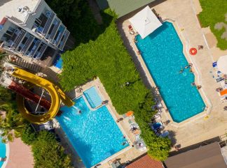 Местоположение: Хотелът се намира на 132 км. от летище Милас, на 90км от летище Даламан, на 500 м. от центъра на Мармарис, на 30 м. от брега на морето. Построен през 1990 г., с обща площ от 4000 м2 , последно реновиран през 2013 г. Стаи: Хотелът разполага общо с 208 стаи с площ, разположени общо в 3 блока. Всички стаи са оборудвани с климатик, телевизор, телефон, баня с душ, сешоар, балкон. Почистване на стаите – всеки ден, смяна на спалното бельо и кърпите – 3 пъти в седмицата. В хотела: Основен ресторант, а-ла-карт ресторант (срещу допълнително заплащане), бар, 2 открити басейна (80м2 и 100м2), 2 водни пързалки, паркинг. За децата: Детски басейн, детска площадка. Платени услуги - сейф (на рецепция), сауна, турска баня, масажи, пералня, лекар. Безплатни услуги: Интернет (в лоби). ПЛАЖ: Градски, пясъчен – чадъри и шезлонги на плажа – срещу заплащане, а при басейна – безплатно. Хранене: All Inclusive – закуска, обяд, вечеря и междинни хранения на шведска маса; алкохолни и безалкохолни напитки местно производство без лимит. |