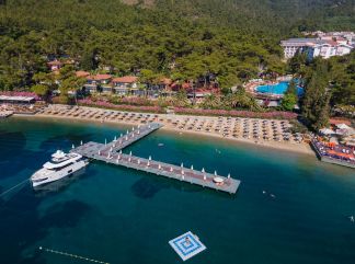 Местоположение: Хотелът се намира на 135 км. от летище Милас, на 90км от летище Даламан, на 6 км. от центъра на Мармарис, на 2 км. от Ичмелер, на брега на морето. Построен през 2006 г., с обща площ от 73 000 m2 . Реновиран през 2025 г. Стаи: Хотелът разполага общо с 543 стаи, от които 218 в основната сграда (5 етажа, 4 асансьора)- Standard room ( спалня и единично легло, 26 м²), Superior Standard room ( спалня и единично легло, 30м²), Family room (две свързани помещения и с две бани, 38м²) , 84 в Блок Б ( 3 асансьора)-Standard room ( спалня и единично легло, 26 м²) и 241 в клубната част-Standard room (26 м²), Superior Standard room ( спалня и единично легло, 35м²), Family room (две свързани помещения и с две бани, 42м²), Marine suite room (спалня, всекидневна, една баня, 110-115 м²). Всички стаи са оборудвани с климатик, телевизор, телефон, баня с душ/вана, сешоар, сет за кафе/чай, мини бар (безалкохолни напитки и бира при пристигане, всекидневно зареждане с вода – трапезна и минерална) сейф (безплатен), WI-FI интернет, балкон. Почистване на стаите – всеки ден, смяна на спалното бельо – 2 пъти в седмицата, кърпите се сменят, ако са оставени на пода в банята., В хотела: Основен ресторант, бюфет за здравословно хранене (ще работи в периода от 01.06.2026 до 30.09.2026, в блок Б), 5 а-ла-карт ресторанта (стек хаус, италиански ресторант, китайски ресторант, японски, рибен - срещу заплащане, кебап хаус - безплатен), 5 бара, сладкарница, 3 открити и 1 закрит басейн, магазини, СПА център, конферентни зали, паркинг. За децата: Детски басейн с водни пързалки, детска площадка, мини клуб (4-12 г.), мини амфитеатър, лунапарк. За младоженци: Специална декорация на стаята, закуска в стаята по време на престоя (еднократно, с предварителна резервация в блок Б), приоритетна резервация за едно посещение в един от а-ла-карт ресторантите (с предварителна резервация), 30% отстъпка от СПА за резервиране на масаж за двойки. Безплатни услуги: Сауна, турска баня, парна баня, фитнес, плажен волейбол, аеробика, тенис на маса, тенис на корт, дартс, анимация, музика на живо. Платени услуги: Масаж, билярд, игрална зала, оборудване на тенис корт, осветление за тенис корт, уроци по тенис, моторни водни спортове. Хранене: Ultra All Inclusive– закуска, обяд, вечеря и междинни хранения на шведска маса; местни и някои вносни алкохолни и безалкохолни напитки без лимит. Плаж: Собствен, пясъчен, 2 платформи – чадъри и шезлонги на плажа и при басейна – безплатно, плажни кърпи – срещу депозит. |