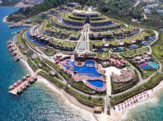 Местоположение: Намира се на 25 км от летище Бодрум, на 8 км от центъра на Бодрум, в района на Торба, на брега на морето. Построен 2012 г., на обща площ от 75 000 М². Реновиран 2020 г. Стаи: Хотелът разполага с общо 311 стаи разположени в една основна сграда, допълнителни вили и блокове: Studio Room (25-35 кв.м с изглед градина или море), Superior Room Sea View (32 - 40 кв.м), Deluxe Room Swim Up (90 кв.м с директен достъп до басейн, джакузи), Deluxe Room sea View (90 кв.м разполага с джакузи), Premium Suite (120 кв.м), Grand Suite (145 кв.м), Maldivian Suite (110 кв.м.), Maldivian Villa (195 кв.м), Deluxe Villa (245 кв.м), Premium Villa (535 кв.м), Grand Villa (725 кв.м.), Palace Villa (2000 кв.м.). Всички стаи са оборудвани с: King Size легло, IPTV, безжичен телефон, телевизор с плосък екран, сейф, който побира лаптоп, мини бар, баня с душ, луксозни принадлежности за баня, сешоар, кантар, кафе машина Неспресо, електрическа кана Бугати, високоскоростен Wi-Fi, балкон или тераса. Делукс стаите са оборудвани допълнително с: джакузи, гардеробна, ютия и дъска за гладене. Всички суити и вили разполагат с джакузи, частен басейн, а някои разполагат и с допълнителни екстри като DVD плейър, система за автоматично управление на стаята чрез iPad и др. Почистване на стаята и смяна на кърпи - всеки ден, смяна на спално бельо - през ден. В хотела: Основен ресторант, 7 алакарт ресторанта с предварителна резервация (италиански, азиатски, близкоизточен, суши, грил/барбекю, индийски, средиземноморски), 2 бара (на плажа и при басейна), сладкарница, открит и закрит басейн, СПА център, конферентна зала, магазини, денонощна рецепция. Безплатни услуги: паркинг, фитнес, сауна, турска баня, аеробика, вечерни шоу проглами с жива музика, дискотека, тенис на маса, дартс. Платени услуги: масажи и процедури в СПА центъра, уиндсърф, химическо чистене и пране, трансфер, кола под наем, магазини, салон за красота, кола под наем, мини маркет, румсървиз. За децата: мини клуб, анимация, детска площадка, детско меню, кът за игра, детегледачка с/у заплащане. Хранене: High Class All Inclusive - закуска, обяд и вечеря на шведска маса, междинни хранения, алкохолни и безалкохолни напитки – без лимит (съгласно концепцията на хотела). Хотелът има право да прави промени в концепцията, без да уведомява предварително туроператора за наложените промени. Плаж: Собствен, пясъчен. Чадъри, шезлонги и плажни кърпи на плажа и при басейна - безплатно. |