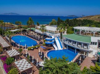 Местоположение: Намира се на 55 км от летище Бодрум, на 20 км от центъра на Бодрум, на 3 км от центъра на Тургутреис, на брега на морето. Построен 1996 г., на обща площ от 10 000 м². Реновиран 2018 г. Стаи: Хотелът разполага с общо 170 стаи, разположени в 3-етажни 5 блока, от които 169 Standart room (20 - 30 м²) и 1 Disabled Room (пригодени за хора с ограничена подвижност - 20 м²). Всички стаи са оборудвани с климатик, телевизор, телефон, баня с душ, сешоар, минибар (зарежда се само с вода), сейф (платен). Почистване на стаите и смяна на кърпите – всеки ден, смяна на спалното бельо – 2 пъти в седмицата. В хотела: Основен ресторант, 4 бара, 2 открити басейна (единият с пързалки) За децата: Мини клуб, мини амфитеатър, лека анимация. Безплатни услуги: Сауна, турска баня, тенис на маса, дартс, Wi-Fi (в лоби ). Платени услуги: Масаж, пилинг, фризьор, фотограф, лекар, детегледачка, химическо чистене, плажна кабана, рент-а-кар, турско кафе, бутилирани напитки и фрешове. Хранене: All Inclusive - закуска, обяд и вечеря на шведска маса, междинни хранения, местни алкохолни и безалкохолни напитки - без лимит (съгласно концепцията на хотела). Плаж: Собствен, пясъчен, платформа.Чадъри и шезлонги на плажа и при басейна – безплатно. Плажни кърпи не се предоставят. Хотелът има право да прави промени в концепцията, без да уведомява предварително туроператора за наложените промени. |