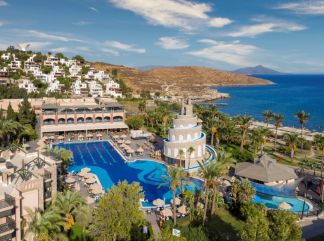 Местоположение: Хотелът се намира на 55 км. от летище Милас, на 18 км. от центъра на Бодрум, в района на залива Бала, на брега на морето. Стаи: Хотелът разполага с общо 365 стаи, от тях стандартни с гледка море или градина (24 м²), стандартни с бънк бед (24 м²), фамилни стаи (40 м²) или суити (60 м²). Всяка една е оборудвана с климатик, телевизор, телефон, баня с душ, сешоар, мини бар, сейф, балкон, WI-FI във всички зони. В хотела: Хотелът разполага с основен ресторант, 3 а-ла-карт ресторанта - италиански, морски и турски (може да се ползва 1 път безплатно при престой от 7 нощувки), 3 бара, външен басейн, вътрешен басейн, водни пързалки, СПА център, паркинг, конферентни зали. Безплатни услуги: сауна, турска баня, парна баня, фитнес, тенис на маса, мини голф, WI-FI (във всички зони), Платени услуги: масаж, магазини, лекар, румсървис. За децата: мини клуб, детски басейн, детска площадка, игрална зала. Хранене: ULTRA ALL INCLUSIVE - закуска, обяд, вечеря и междинни хранения на шведска маса; местни алкохолни и безалкохолни напитки - без лимит (съгласно концепцията на хотела). Плаж: Собствен, пясъчен. Чадъри, шезлонги и матраци - безплатно. Плажни кърпи - безплатно. |
