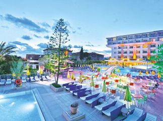 Местоположение: Намира се на 116 км от летище Анталия, на 126 км от центъра на Анталия, на 12 км от центъра на Алания, на брега на морето. Построен 1997 г., на обща площ от 10 000 м2. Частично реновиран 2019 и 2022 г. Стаи: Хотелът разполага с общо 225 стаи, от които 186 Standard (23-26 м2), 23 Family Room (2 спални, 1 баня, 35-40 м2), 14 Terrace Facing Pool (с достъп до общ басейн от терасата - 23-26 м2), 2 Handicap Room (пригодена за хора с ограничена подвижност, 23-26 м2). Всички стаи са оборудвани с климатик, телевизор, телефон, баня с душ, сешоар, сет за чай/кафе, минибар (безплатен), сейф (платен), балкон. Почистване на стаите и смяна на кърпите – всеки ден, смяна на спалното бельо – 2 пъти в седмицата. В хотела: Основен ресторант, 2 снек ресторанта, сладкарница, 4 бара, 4 открити и 1 закрит басейн, 2 водни пързалки за възрастни и 3 за деца, СПА център. За децата: 2 детски басейна, детска площадка, мини клуб (4-11 г.), детска анимация. Безплатни услуги: Фитнес, тенис на маса, плажен волейбол, дартс, сутрешна гимнастика, йога, водна гимнастика, водно поло, боча, жива музика, анимация, Wi-Fi (в стаите и в общи площи). Платени услуги: Турска баня, масаж, СПА процедури, фризьор, лекар, химическо чистене, водни спортове, рент-а-кар. Хранене: All Inclusive - закуска, обяд и вечеря на шведска маса, междинни хранения, местни алкохолни и безалкохолни напитки - без лимит (съгласно концепцията на хотела). Плаж: Собствен, на 500 м от хотела, пясъчно - чакълест. До плажа се стига посредством подземен тунел, предлага се и безплатен шатъл бус. Чадъри, шезлонги и плажни кърпи на плажа и при басейна – безплатно. Хотелът има право да прави промени в концепцията, без да уведомява предварително туроператора за наложените промени. |