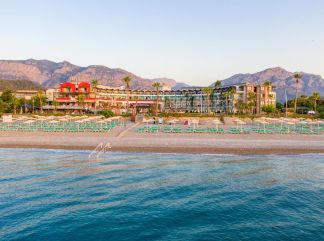 Местоположение: Хотелът се намира на 60 км. от летище Анталия, на 650 м. от центъра на Кемер. Стаи: Хотелът разполага с общо 186 стаи, всички оборудвани с климатик, телевизор, телефон, баня с вана, сешоар, минибар (безплатен при пристигане, след това се зарежда срещу заплащане), сейф (платен), балкон. В хотела: Основен ресторант, 3 а-ла-карт ресторанта (рибен, средиземноморски, турски – 1 безплатно посещение при минимум 7 нощувки), 4 бара, 2 открити и 1 закрит басейн, 3 водни пързалки, ТВ и кинозала, салон за красота, фризьор, пералня, магазини, обменно бюро, коли под наем, WiFi интернет (платен). Хранене: All inclusive - закуска, обяд, вечеря, междинни хранения, местни алкохолни и безалкохолни напитки. Плаж: Собствен - чакълест плаж. Чадъри, шезлонги, матраци при басейна и плажа - безплатно. Хотелът има право да прави промени в концепцията, без да уведомява предварително туроператора за наложените промени. |