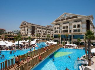 Местоположение: Хотелът е разположен на 55 км. от летището на гр. Анталия, на 2 км. от селището Чолаклъ, на брега на морето. Построен през 2011 год., обща площ 22 000 м2. Стаи: Хотелът разполага с 509 стаи. Всички стаи са оборудвани с: централен климатик, телевизор, телефон, мини бар (вода и безалкохолни напитки се зареждат ежедневно, безплатно), душ/вана, сешоар, сейф (безплатно), балкон. Почистване на стаята – ежедневно, смяна на спално бельо – 3 пъти в седмицата. В хотела: Основен ресторант с диетично и вегетарианско меню, 5 ресторанта a - лa - карт (италиански, турски, рибен, мексикански, китайски), 6 бара, открит басейн, закрит басейн, 3 водни пързалки, кинотеатър, лекарски кабинет, SPA - център, фризьор, магазини,2 конферентни зали. За децата: детско меню, детски басейн, аквапарк, детски мини клуб(4-12г.), младежки клуб(13-16г.) Безплатни услуги: турска баня, сауна, вътрешен басейн, тенис на корт, тенис на маса, дартс, мини голф, баскетбол, фитнес зала, Интернет. Платени услуги: масаж, билярд, боулинг, кан, водни спортове, фризьор, СПА - център. Хранене: Ultimate All inclusive – закуска, обяд и вечеря с включени междинни хранения, алкохолни и безалкохолни напитки - без лимит (съгласно концепцията на хотела). Плаж: Собствен пясъчен плаж. Чадъри, шезлонги и матраци - безплатно. Плажни хавлии - срещу депозит. Хотелът има право да прави промени в концепцията, без да уведомява предварително туроператора за наложените промени. |
