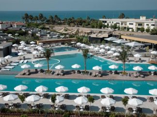 WEBSITE на хотела. Разположение Намира се на 135 км от летище Анталия, на 145 км от центъра на Анталия, на 3 км от центъра на Алания, на 50 м от брега на морето. Построен 1998 г., на обща площ от 28 000 м2. Реновиран 2021 г. В стаите Хотелът разполага с общо 340 стаи, разположени в 5 блока и вили Villas, от които 49 Standart Room (23 м2), 26 Comfort Family 1 Bedroom (1 спалня, 1 баня, 1 дневна - 35 м2), 24 Comfort Family 1 Economy (разположени на последен етаж, 1 спалня, 1 баня, 1 дневна - 35 м2), 42 Comfort Family 2 Bedroom (2 отделни спални, 1 баня, 1 дневна - 50 м2), 41 Standart Family Room (2 спални, 1 баня), 41 Villa (2 спални, 1 баня, 1 дневна с кухненски бокс, 10 м2 веранда с директен достъп до басейн – 50 м2).Всички стаи са оборудвани с климатик, телевизор, телефон, баня с душ, сешоар, сет за чай/кафе, минибар (безплатен), сейф (безплатен).Почистване на стаите – всеки ден, смяна на спалното бельо и кърпите – 2 пъти в седмицата. На територията на хотела Основен ресторант, 2 а-ла-карт ресторанта (интернационален, италиански – срещу заплащане, с предварителна резервация); (ресторант при аквапарка и ресторант на плажа – срещу заплащане), 6 бара (бар на плажа и кафене – срещу заплащане), 3 открити и 1 закрит басейн, аквапарк с 4 водни пързалки, СПА център, дискотека, магазини, 1 конферентнa залa. За децата: Мини клуб (4-12 г), открит и закрит детски басейн, детска площадка, детска количка (под наем). Безплатни услуги: Фитнес, тенис на маса, софт анимация, Wi-Fi (в стаите и в общи площи). Платени услуги: Сауна, турска баня, парна баня, масаж,козметични процедури, фризьор, лекар, пране и химическо чистене, гладене, билярд, осветление и оборудване за тенис корт, оборудване за падел, електронни игри, водни спортове, рент-а-кар. Хранене All Inclusive - закуска, обяд и вечеря на шведска маса, междинни хранения, местни алкохолни и безалкохолни напитки - без лимит (съгласно концепцията на хотела). Плаж Собствен, на 50 м от хотела, пясъчно-чакълест. До плажа се достига през подземен тунел. Чадъри, шезлонги и плажни кърпи на плажа и при басейна – безплатно. Храна и напитки на плажа – срещу заплащане. Забележителности