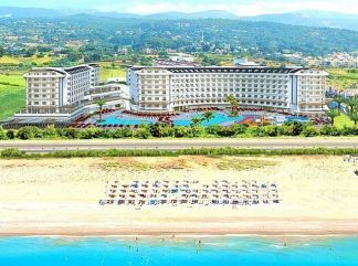 Местоположение Хотелът е разположен на 87 км. от летище Анталия, на 97 км. от центъра на Анталия, на 20 км. от центъра на гр.Сиде. Стаи климатик, директен телефон, LCD-телевизор, балкон, мини бар, баня с душ, сешоар, сейф, балкон или тераса Плаж Собствен на 50м. от хотела, пясъчно - чакълест. Бар на плажа - безплатно. На басейна и на плажа: чадъри, шезлонги, матраци и плажни кърпи (срещу депозит) - безплатно. Удобства Основен ресторант, 2 а - ла - карт ресторанта, 2 лоби бара, бар на плажа, бар на басейна, диско бар, търговски център, доктор, тв салон, закрит басейн, открит басейн, детски басейн, 5 водни пързалки, интернет кафе, фитнес център, тенис на маса, тенис. Безплатни Услуги турска баня, сауна, парна баня, фитнес, аеробика, аквааеробика, плажен волейбол, баскетбол, тенис на маса, дартс, мини-голф, боча, баскетбол, анимационна програма, безжичен интернет (в лоби) Платени Услуги сейф, масаж, джакузи, игрални зала, интернет кафе, водни спортове, СПА - център |