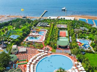 Местоположение Хотелът е разположен 55 км от летище Анталия, на 12 км от Сиде, на 15 км от Манавгат, на 3 км от селището Колаклъ, на брега на морето. Построен е през 2004 г., на обща площ от 39 000 м2, последното обновяване е направено през 2013 година. В хотела Основен ресторант , диетично меню, 3 ресторанта a - лa - карт (италиански, турски, рибен – с предварително записване, за целия престой еднократното посещение на всеки от ресторантите е безплатно), 9 бара, 2 открити басейн, закрит басейн, 5 водни пързалки+ 3 водни пързалки за деца. Безплатни услуги: турска баня, сауна, джакузи, 2 тенис - игрища, тенис на маса, фитнес зала, плажен волейбол, боча, дартс, футбол. Платени услуги: боулинг (2 пътеки), билярд, масажи, водни спортове на плажа, осветление на тенис кортовете, игрални автомати, интернет - кафе. Стаи Хотелът разполага с 464 стаи. Всички стаи са оборудвани с: централен климатик, сешоар, телевизор, телефон, сейф, баня с вана, балкон. Почистване на стаите - ежедневно, смяна на спалното бельо – 2 пъти седмично.Фамилните стаи в допълнение предлагат диван и легло на два етажа за децата. Услуги Хранене: All inclusive – закуска, обяд, вечеря, междинни закуски и хранения, местни алкохолни и безалкохолни напитки без лимит. Плаж Собствен, пясъчен. Кей. Бар на плажа - безплатно. При басейна и на плажа - чадъри, шезлонги, матраци – безплатно. Плажни кърпи: безплатно. Развлечения Дневни състезания, нощна анимация, шоу програми, жива музика, дегустация на вино, тематични вечери, готварски курсове, дискотека. Търговски център с няколко магазина, безплатен Wi-Fi навсякъде в хотела, Интернет кафе. За децата: Детски клуб за деца от 4 до 11 години. Анимация, малка зоологическа градина, детска площадка, детски бюфет, детска дискотека. |