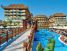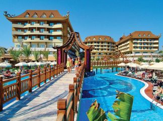 Местоположение Хотелът се намира на 48 км. от летище Анталия, на 5 км. от центъра на Сиде, на 10 км. от Манавгат, на брега на морето. Построен през 2008 г. с обща площ от 50 000 м2. В хотела Основен ресторант, 4 а - ла - карт ресторанта -платени(с предварителна резервация), 9 бара, 6 открити и 1 закрит басейн, водни пързалки, магазини, Спа - център, дискотека, 4 конферентни зали. За децата: Детско меню, детски площадки, мини клуб (4-12 г.), 2 детски басейна, водни пързалки, мини дискотека, анимация, лунапарк, зоопарк. Безплатни услуги: Турска баня, сауна, фитнес, дартс, тенис на маса, плажен волейбол, аеробика, жива музика, анимация, интернет (в лоби). Платени услуги: Масаж, център за красота, фризьор, магазини, билярд, боулинг, интернет кафе, компютърни игри, химическо чистене, лекар, детегледачка, тенис на корт с осветление, скоростен интернет. Стаи Хотелът разполага с общо 564 стаи, от които 408 стандартни стаи и 139 фамилни стаи. Всички стаи са оборудвани с: климатик, сателитна телевизия, телефон, баня с вана, сешоар, минибар (платено), сейф (безплатно), балкон. Почистване на стаите и смяна на кърпите – всеки ден, смяна на бельото – 2 пъти в седмицата. Плаж Собствен, пясъчен. Чадъри и шезлонги на плажа и при басейна – безплатно, плажни кърпи – безплатно, смяна на плажната кърпа – срещу заплащане. Услуги включени в цената Хранене: Ultra All Inclusive – закуска, обяд, вечеря и междинни хранения на шведска маса, местни и някои вносни алкохолни и безалкохолни напитки без лимит. |