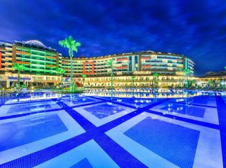 Местоположение Хотелът се намира на 98 км. от летище Анталия, на 26 км. от Алания, на брега на морето. Построен през 2017 г., с обща площ 130 000 м2. В близост има спирка на градски транспорт и магазини. Хотела се намира на брега на заливчето Фугла, с леко извит пясъчен плаж. Разстоянието до търговски обекти е около 5 минути пеша. В хотела Основен реасторант, 2 а-ла-карт ресторанта (рибен, турски - с предварителна резервация), сладкарница, гьозлеме пекарна, 7 бара, дискотека (входа е платен, консумация на напитки - безплатно), 7 открити и 1 закрит басейн, 2 аква парка (общо 7 пързалки), 3 конферентни зали, паркинг. Стаи Хотелът разполага с общо 821 стаи, разположени в 6 етажна сграда, всички оборудвани с климатик, телевизор, телефон, баня с душ/вана, сешоар, сейф (платен), минибар (минерална вода в деня на пристигане, след това се допълват ежедневно), сет за кафе/чай, балкон. Почистване на стаите - всеки ден, смяна на спално бельо - 3 в седмицата. Плаж собствен - пясъчен. Чадъри, шезлонги и кърпи на плажа и при басейна - безплатно. За децата детски басейн, мини клуб(4-12г.), детски пързалки, детско меню (за деца над 3 години), диетично меню, столчета за деца, тематични вечери. Безплатни Услуги Сауна, турска баня, фитнес, водна аеробика, водно поло, тенис на маса, дартс, плажен волейбол, баскетбол, WiFi (в лоби). Платени Услуги Масаж, СПА център, пилинг, билярд, пейнтбол, химическо чистене, магазини, водни спортове. Хранене Ultra All inclusive - закуска, обяд и вечеря на шведска маса, междинни хранения, алкохолни и безалкохолни напитки - без лимит (съгласно концепцията на хотела). |