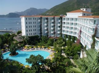 Местоположение Хотелът е разположен на 90 км от летището на гр Даламан, на 3 км от центъра на гр. Мармарис, на брега на морето. В хотела Хотелът разполага с основен ресторант, вегетарианско меню, диетично меню, 2 бара, открит басейн, лекар на повикване, пералня, конферентна зала (за 100 чел.) За децата За децата е предвиден детски басейн Стаи Стаите разполагат с баня, сешоар, индивидуален климатик, телевизор, телефон, мини бар (платено), сейф (платено), под – мокет, балкон (1 стая без балкон), почистване на стаята – ежедневно, смяна на спално бельо – 3 пъти в седмицата, room service (платено) Плаж Плажът е собствен, пясък.На басейна и на плажа: чадъри, шезлонги – безплатно; матраци – платено. Плажни кърпи: с депозит Безплатни Услуги Безплатни са фитнес зала, тенис на маса, безжичен интернет (на лоби) Платени Услуги Срещу заплащане можете да ползвате турска баня, сауна, масаж, водни видове спорт |