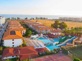 Местоположение: Хотелът се намира на 18 км от Алания, перлата на Средиземно море. Разположен е на брега на морето в региона Тюрклер, известен със своите пясъчни плажове, на 5 км от Авсалар и центъра на град Конаклъ, на 90 км от летище Анталия и на 60 км от летище Газипаша. Стаи: Хотелът е пуснат в експлоатация през 2006 г. и се състои от 12 вили на триетажа на площ от 48000 кв.м. Съоръжението разполага с 473 стаи. През 2016 г. всички стаи бяха обновени за комфорта и удобството на гостите. В стаите има климатик, сателитна телевизия, телефон, баня с душ или вана, сешоар, мини бар (безплатен - вода), сейф (платен), балкон, ламиниран под. Почистване на стаите – всеки ден, смяна на бельото и кърпите – 3 пъти в седмицата. Хранене: Хотелът разполага с основен ресторант и два а`ла карт ресторанта. База All Inclusive включва закуска, обяд, вечеря и междинни хранения на шведска маса, местни алкохолни и безалкохолни напитки без лимит в интервала 10:00 - 23:00 ч. Плаж: Хотелът има собствен пясъчно-чакълест плаж, четири басейна. Чадъри, шезлонги, матраци и плажни кърпи на плажа и при басейна се предоставят безплатно. Развлечения: За пълния релакс на своите гости и за техния активен отдих хотелът предлага турска баня, сауна, фитнес, дартс, тенис на маса, баскетбол, плажен волейбол, аеробика, анимация. Срещу допълнително заплащане: СПА център, масаж, фризьор, магазини, билярд, химическо чистене, лекар, тенис корт, водни спортове.За децата има детска анимация, три детски басейна с пързалки, детска площадка, мини клуб (4-12 год.), джуниър клуб (13-16 год.). |