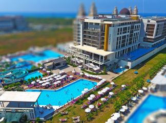 Местоположение: Хотелът се намира на 300 м от морето в Сиде, на 4 км от Манавгат. Центърът на Сиде се намира на 8 км от хотела, а летището на Анталия е на 75 км. Стаи: Хотелът се състои от една 8-етажна сграда, в която са разпределени 362 климатизирани стаи, от които 177 Standart Room (35 кв.м), 80 Standart Pool Side Room (с изглед - басейн, 35 кв.м), 52 Standart Sea Side Room (със страничен изглед море - 35 кв.м), 10 Swim Up (с директен достъп до общ басейн - 35 кв.м), 36 Family Room (2 спални, 2 бани - 55 кв.м), 3 Disabled Room (пригодени за хора с ограничена подвижност - 35 кв.м), 2 Penthouse Suite (1 спалня, 1 баня с джакузи, голяма тераса - 115 кв.м), 2 King Suite (2 спални, всекидневна, 2 бани, разположени на 2 етажа - 140 кв.м). Всички стаи са оборудвани с климатик, телевизор, телефон, сет за чай/кафе, минибар (зарежда се всекидневно с мин. вода и безалкохолни напитки - безплатно), сейф (платен), баня с душ, сешоар, балкон. Почистване на стаите и смяна на кърпите - всеки ден, смяна на спалното бельо - 2 пъти в седмицата. Хранене: На разположение на гостите са основен ресторант Space и 2 а`ла карт ресторанта: AKDENIZ: - рибен ресторант и GUSTO - турска кухня. Освежаващи напитки и закуски се поднасят в 6 бара: SOFA LOUNGE лоби бар, бар при басейна, бар на плажа, Terrace Bar, диско бар, Арена бар на плажа. Плаж: Собственият пясъчен плаж се намира на 300 м от хотела, има осигурен безплатен шатъл. За удобство на гостите има три открити басейна с три пързалки. Чадъри и шезлонги при басейна и на плажа се предоставят безплатно. Развлечения: За пълноценния релакс на своите гости и за активния им отдих хотелът предлага анимация, сауна, хамам, парна баня, фитнес център, тенис на маса, плажен волейбол, шах, мини футбол, дартс, СПА и уелнес център. Срещу допълнително заплащане: билярд, водни спортове, масажи, пилинг, зала за игри, магазини, пране, наем на коли, лекар. За децата има мини клуб, детска площадка, детски басейн. |