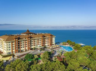 Местоположение: Намира се на 155 км. от летище Анталия, на 17 км. от центъра на Алания. Построен през 2007 г., с обща площ 120 000 м2. Стаи: Хотелът разполага с общо 567 стаи, сред които: Economy Villa Standard Room (34 m2), Villa Standard Room (34 m2), Villa Standard Room Sea View (34 m2), Main Building Standard Room (31 m2), Terrace Suite (64 m2), Junior Suite (71 m2), Corner Suite (64 m2), Penthouse Suite (2 помещения, всяко по 50 m2). Всички стаи са оборудвани климатик, телевизор, телефон, баня с душ и вана, сешоар, тоалетни принадлежности, минибар (зареждане с разхладителни напитки – всеки ден), сет за приготвяне на чай/кафе, сейф, балкон. В хотела: Основен ресторант, 3 а-ла-карт ресторанта (италиански, турски, рибен – срещу допълнително заплащане), 3 снек ресторанта - възможност за приготвяне на специални ястия за гости с алергии, 8 бара, сладкарница, 5 открити басейна, вътрешен отопляем басейн, аквапарк с 8 пързалки, фитнес, СПА център, магазини, 3 конферентни зали с оборудване, Wi-fi интернет – според концепцията на хотела. За децата: детски ресторант, детски басейн, детски аквапарк с 4 пързалки, детски клуб, детска площадка, детски столчета за хранене, детска количка (платено), детегледачка (платено). Безплатни услуги: Сауна, турска баня, парна баня, фитнес, билиярд, тенис корт – при придварителна резервация, екипировка – срещу депозит, тенис на маса, плажен волейбол, баскетбол, мини футбол, анимационна програма, музика на живо, паркинг. Платени услуги: Масажи, козметични процедури, моторн водни спортове, игрална зала, лекар, пералня и химическо чистене, рум сървиз, рент-а-кар. Хранене: Ultra All Inclusive – закуска, обяд и вечеря на шведска маса, междинни хранения, местни алкохолни и безалкохолни напитки - без лимит. Плаж: Собствен, пясъчно-чакълест плаж, на 200 метра от хотела с дължина на плажната ивица 350 м, удостоен със сертификат "Син флаг". Достъп до плажа с шатъл. Снек бар на плажа (безплатно). Чадъри, шезлонги и матраци на плажа и при басейна – безплатно. Плажни кърпи – безплатно. Хотелът има право да прави промени в концепцията, без да уведомява предварително туроператора за наложените промени. |