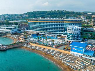 Местоположение: Намира се на 90 км. от летище Анталия, на 95 км. от центъра на Анталия, на 30 км. от центъра на Алания, на 1 км. от селището Окурджалар, на брега на морето. Посторен през 2010 г., с обща площ 24.000 м2. Стаи: Хотелът разполага с общо 598 стаи, разположени в една 10-етажна основна сграда, от които 537 Standard room (с изглед суша или море - 26-36 m²), 29 Doublex family land view (на 2 нива, всяко от които има 1 спалня и 1 баня, 65–75 м2); 12 Family room sea view (2 спални – 50 м2). Всички стаи са оборудвани с климатик, телевизор, телефон, баня с душ, сешоар, сет за кафе/чай, минибар (вода, безалкохолни напитки, бира – безплатен), сейф (безплатен). Почистване на стаите и смяна на кърпите - всеки ден, смяна на спалното бельо - 2 пъти в седмицата. В хотела: Основен ресторант, 6 а-ла-карт ресторанта (срещу заплащане), сладкарница, 7 бара, дискотека, 3 открити и 1 закрит басейн, 3 водни пързалки, СПА център, магазини, 2 конферентни зали. ЗА ДЕЦАТА: Открит и закрит детски басейн, мини клуб (4-12г.), детска анимация, мини кино, мини диско. БЕЗПЛАТНИ УСЛУГИ: Сауна, турска баня, парна баня, фитнес, аеробика, тенис на маса, 2 тенис корта, дартс, боча, анимация, жива музика, тематични партита, Wi-Fi (в Лоби). ПЛАТЕНИ УСЛУГИ: Масаж, пилинг, фризьор, химическо чистене, лекар, детегледачка, осветление за тенис корт, билярд, боулинг, наем на велосипеди, водни спортове, интернет кафе, рент - а кар. ПЛАЖ: Собствен, платформа (4500 m2). Чадъри, шезлонги и матраци на плажа и при басейна - безплатно. Плажни кърпи – срещу депозит. Хранене: Ultra All Inclusive - закуска, обяд и вечеря на шведска маса, междинни хранения, алкохолни и безалкохолни напитки - без лимит (съгласно концепцията на хотела). Хотелът има право да прави промени в концепцията, без да уведомява предварително туроператора за наложените промени. |